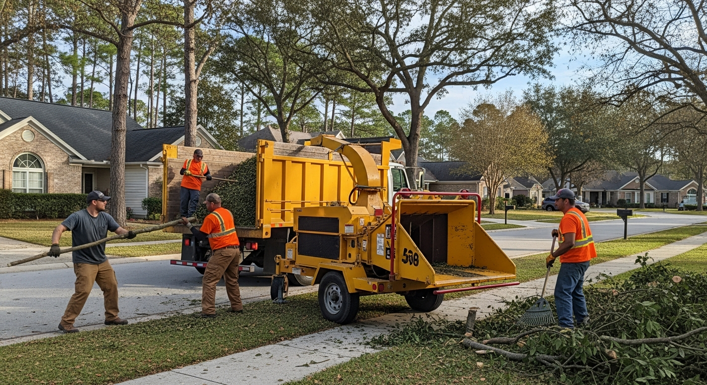 Dechiquetage sur site de toutes les branches et residus. Le bois rameal fragmente (BRF) peut etre utilise comme paillis gratuit pour votre jardin.